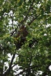 This defensive-only behavior is most obviously demonstrated when bees swarm...but first a lesson on beekeeping's four-letter-word. Swarming is an instinctive activity whereby an colony of bees, sensing abundant resources (nectar, pollen) decides to replicate itself by creating a queen to hang with the old hive, taking the old queen, and creating a new colony with about 40 percent of the colonies workers. The exiting bees gorge themselves on honey to prepare for the trip and exit the hive en masse in quite a production. From there they usually land a few feet away from the mother hive and form a ball-o-bees while scouts are sent out to explore the landscape for a new home.