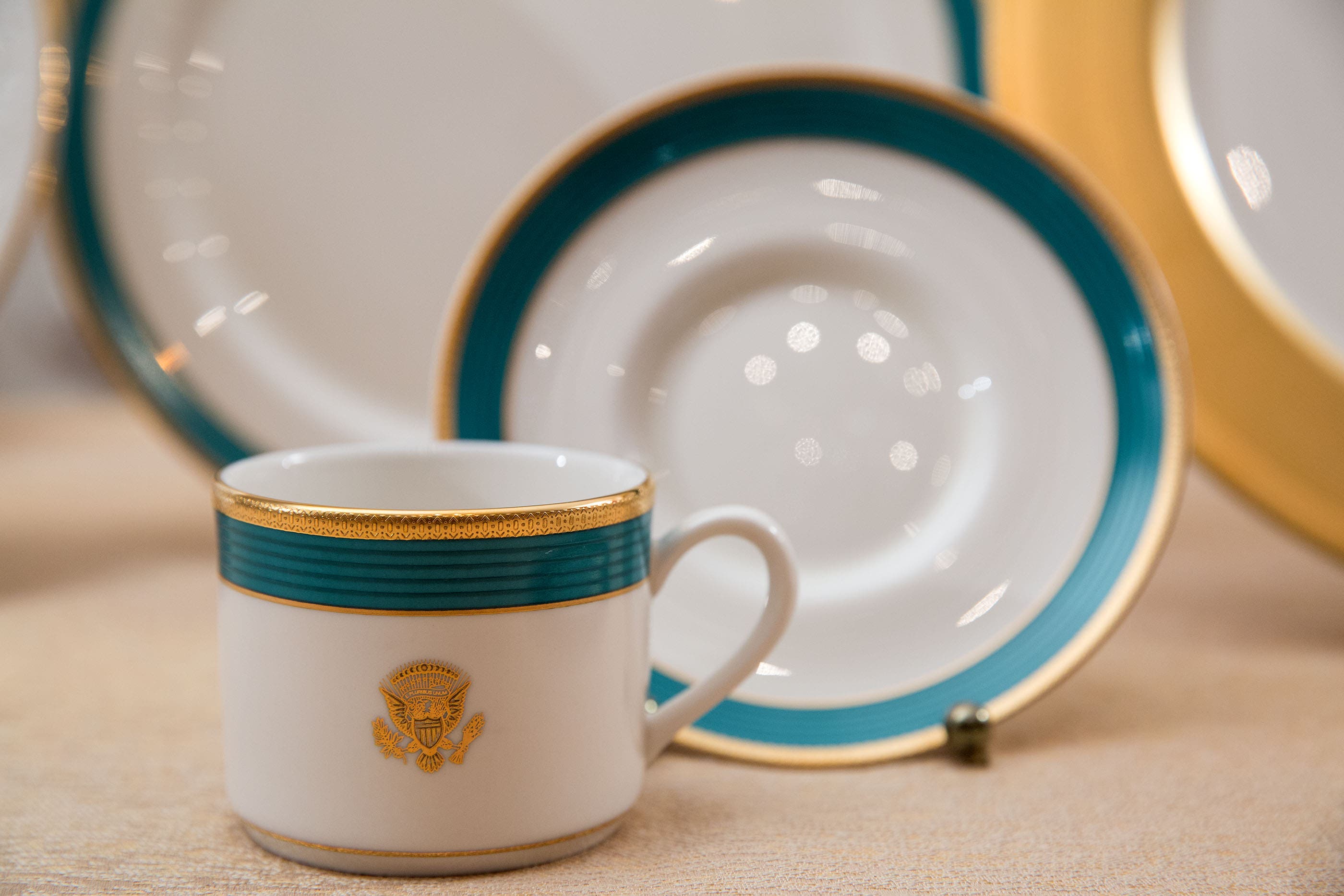 A fluted band of the Kailua Blue color is named for the waters off the President’s home state of Hawaii. Framed by a textured gold rim and a simple gilt inner line, it appears on all pieces of the service except the service and dinner plates.
