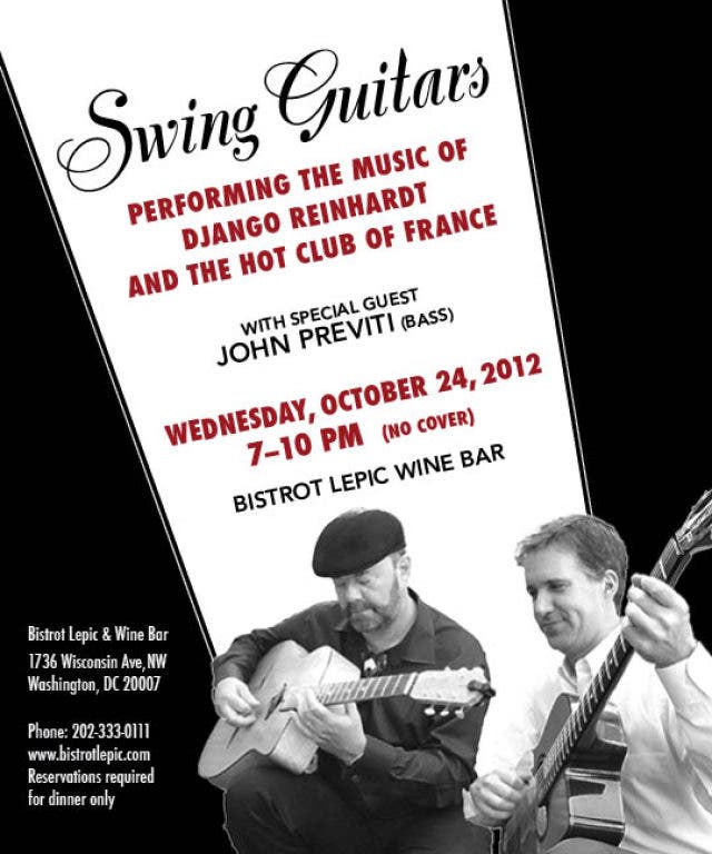 LIVE at Bistrot Lepic this Wednesday (10/24) with SPECIAL GUEST jazz bassist extraordinaire John Previti, Swing Guitars is a professional acoustic gypsy jazz guitar trio that plays the spirited original music of virtuoso gypsy jazz guitarist Django Reinhardt and the Hot Club of France, a sound that helped culturally define Paris of the mid 1930's and '40s. With a broad repertoire of hot swing tunes, beautiful ballads, contemporary latin rhythms and authentic french musette, Swing Guitars pays adds to this evolving musical tradition in an exciting gypsy guitar style duo. NO COVER, NO MINIMUM and GREAT WINE and FOOD to compliment the music!!