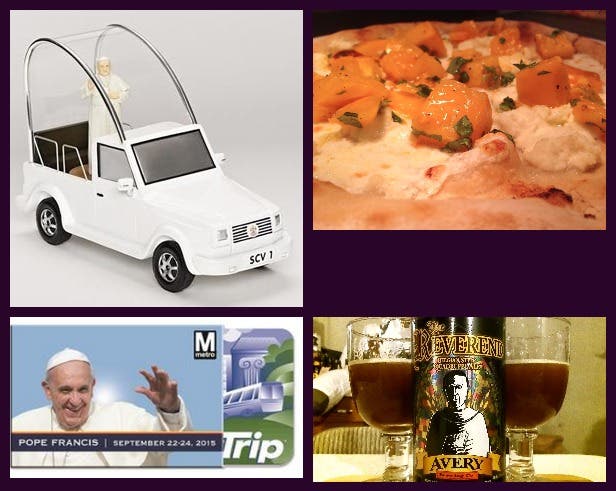 PHOTOS: Popemobile, carried at the Basilica’s gift shop; for $99; “Pope’s Pizza” at Ella’s Wood-Fired Pizza; “The Revered” brew by Avery served up at Brookland Pint, and a commemorative DC Metro fare card.