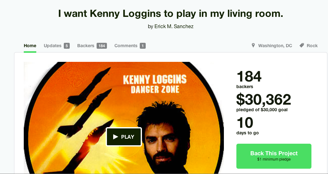 “Look, this is simple. If I raise 30 grand, Kenny Loggins will come play an acoustic set at my house for 75 minutes.