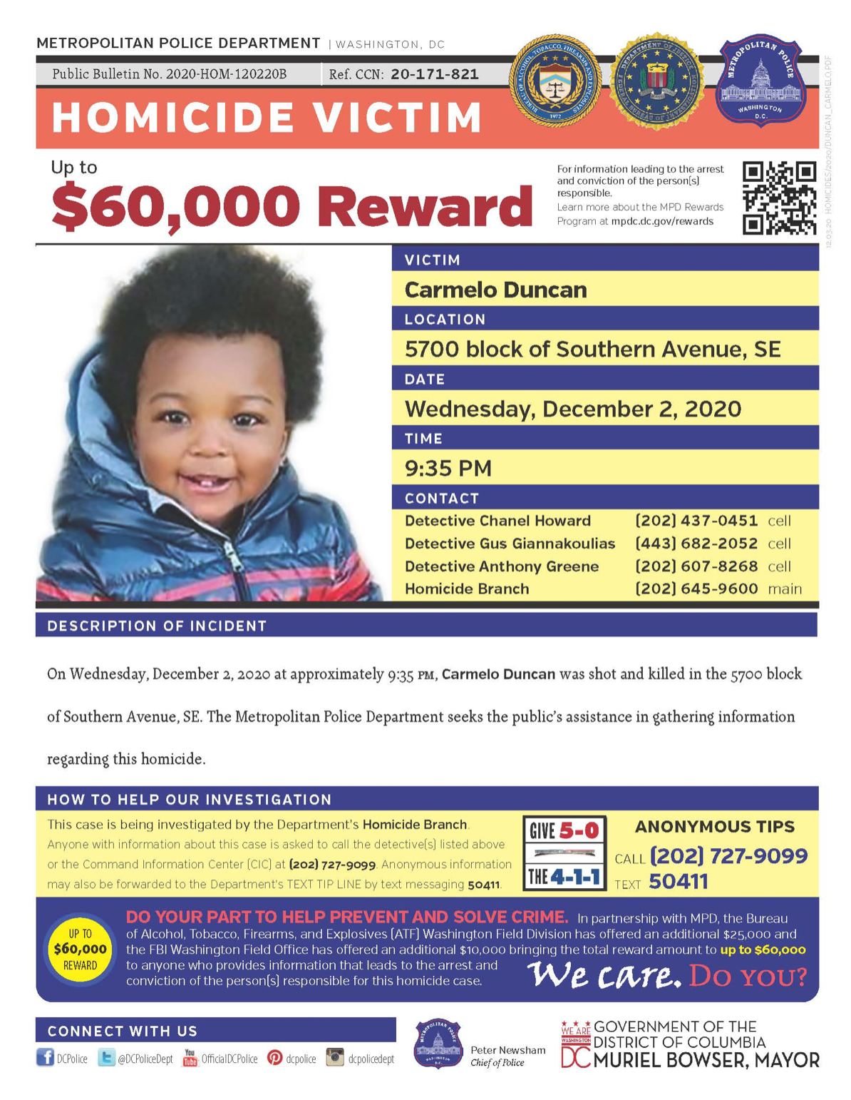 MPD is currently offering a reward of up to $25,000 for information leading to the arrest and conviction of any persons responsible for committing a homicide in the District. FBI and ATF are offering additional reward money in the case, bringing the total reward amount to $60,000.