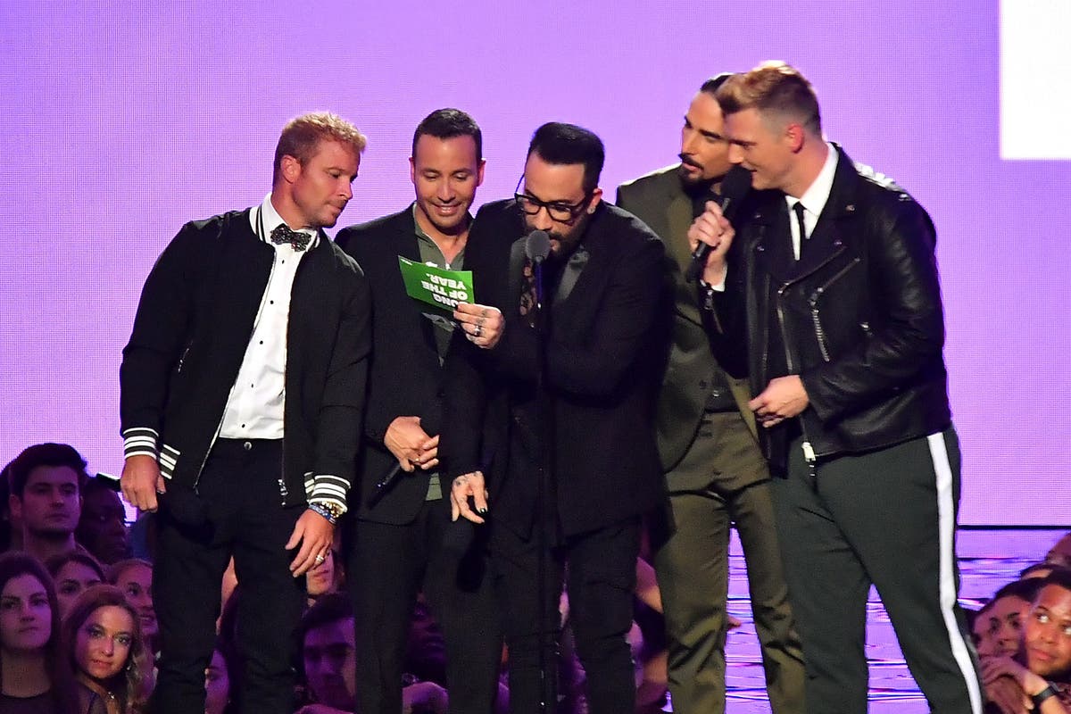 NEW YORK, NY - AUGUST 20: AJ McLean, Brian Littrell, Howie Dorough, Howie Dorough, and Nick Carter of Backstreet Boys speak onstage during the 2018 MTV Video Music Awards at Radio City Music Hall on August 20, 2018 in New York City. (Photo by Michael Loccisano/Getty Images for MTV)