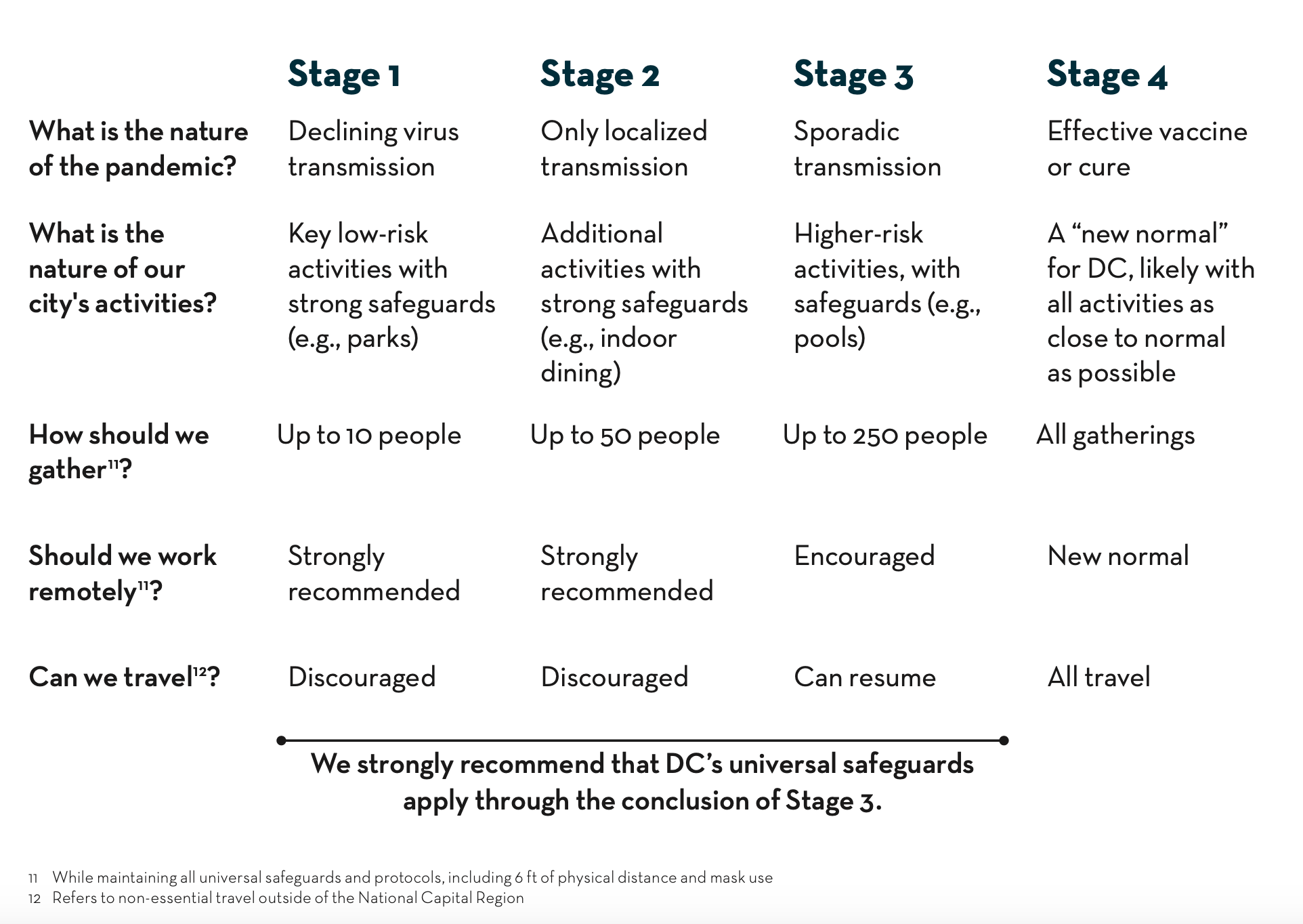 "Stage One is characterized by decreased community spread, allowing for low-key activities with strong safeguards to resume for less than 10 people and continuing to encourage telework," Chertoff said. "Stage Two is when we get to the point of merely localized community spread and at that point we would allow additional activities to resume with strong safeguards, including limiting gatherings to 50 or fewer and still recommending telework. Stage Three is characterized by sporadic community spread, which would allow at that point for higher risk activities to resume with gatherings up to 250 or fewer residents and telework should still be encouraged or travel could resume. Stage Four is ultimately what we all hope for and long for, which is a vaccine that makes this problem totally recede."