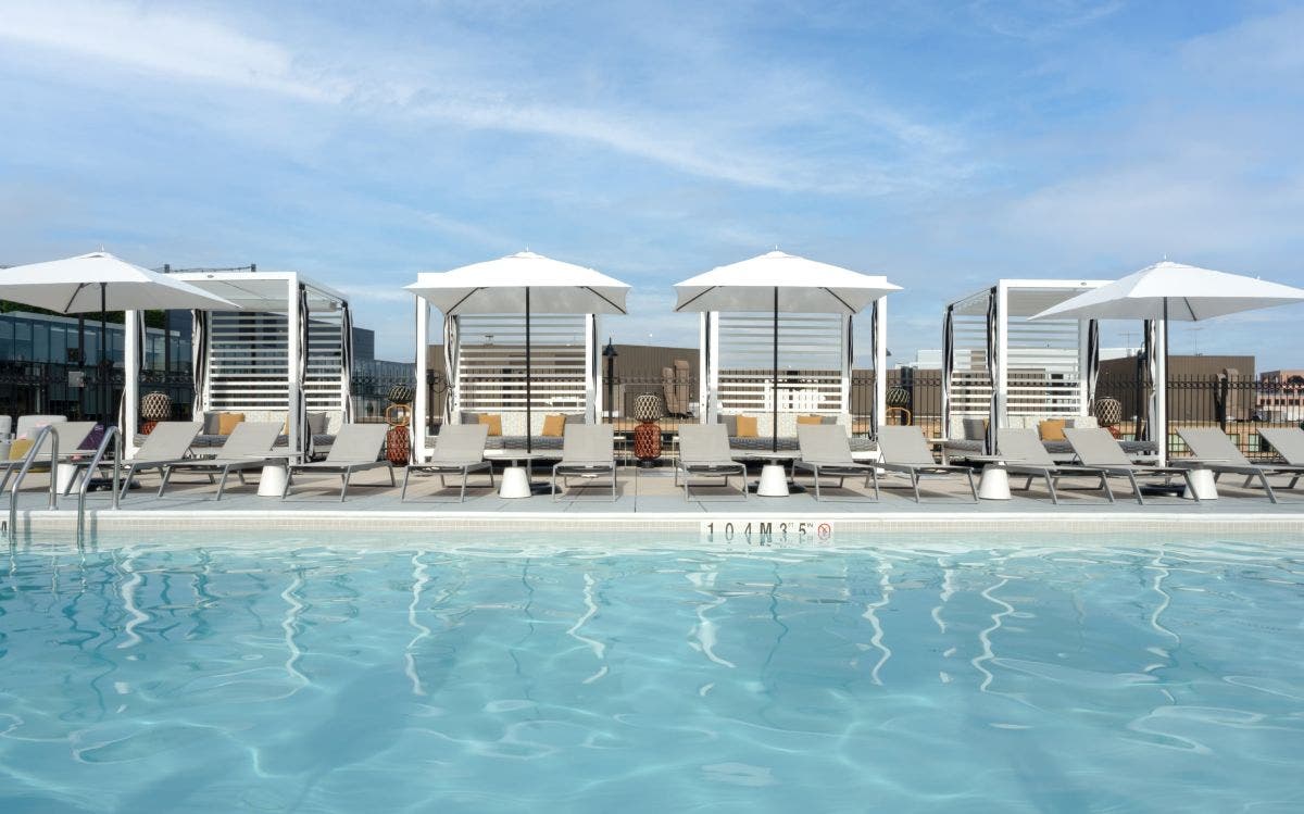 An 8,000-square-foot rooftop space at YOTEL Washington DC features an 800-square-foot pool, sun decks and resort cabanas.