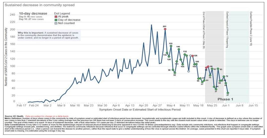 As of Thursday, the District has reached 10 days of sustained decrease in community spread, which is detailed in this chart: