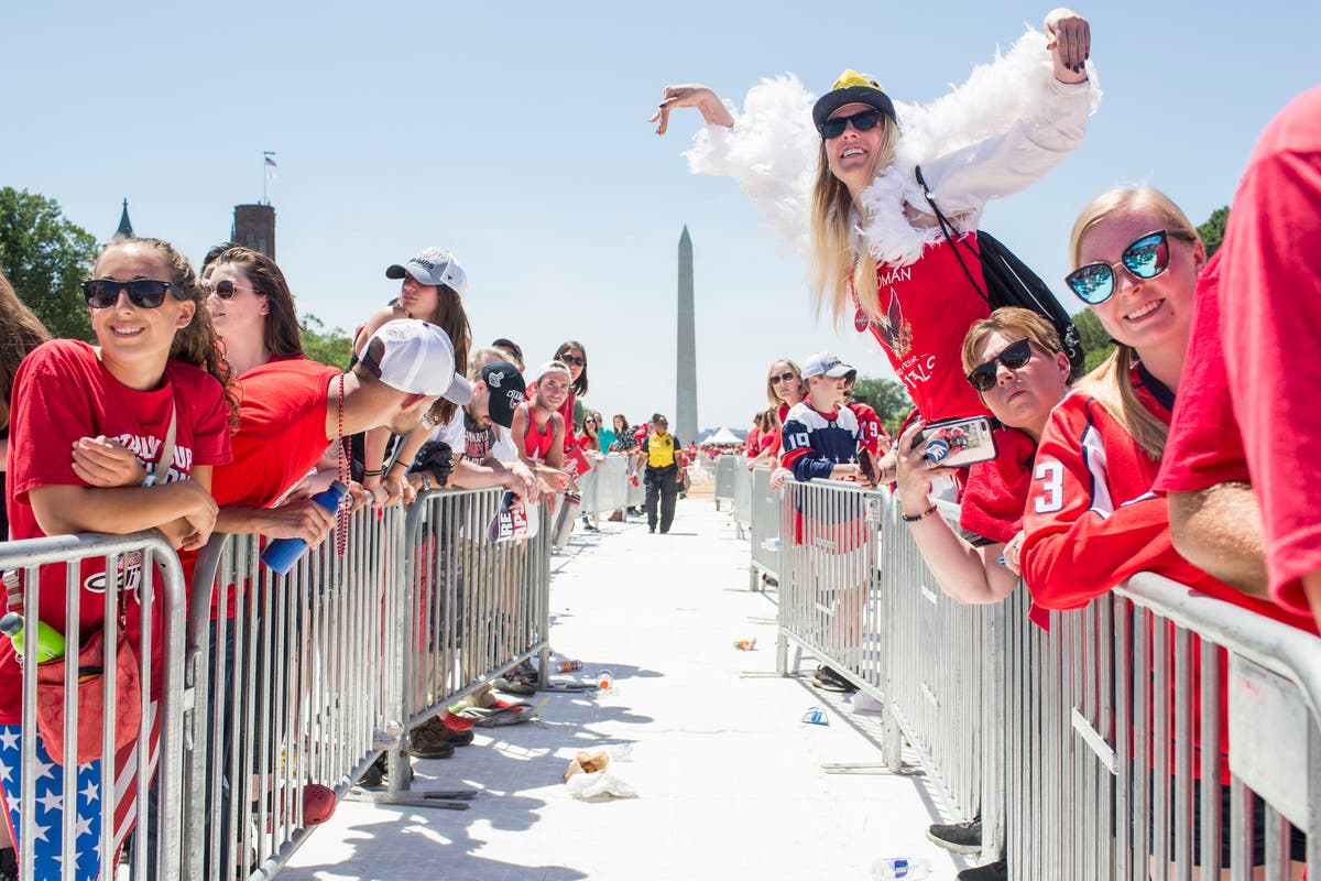 WASHINGTON, DC - JUNE 12: Fans cheer at a rally celebrating the NHL Stanley Cup champion Washington Capitals on the National Mall on June 12, 2018 in Washington, DC. (Photo by Zach Gibson/Getty Images)