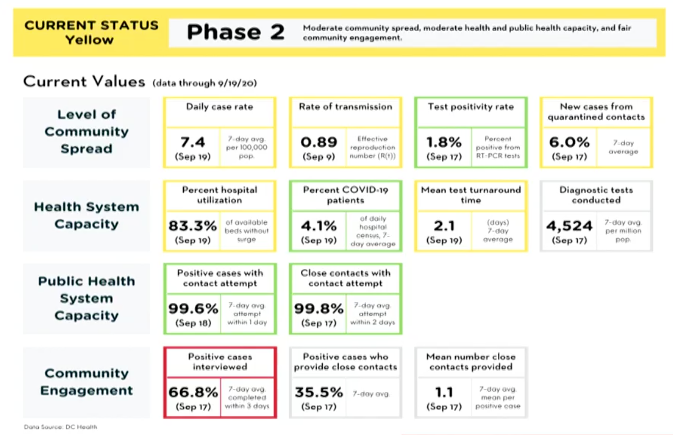 The new graphic employs a color grid to make it easier for people to understand where the District is in its progress toward a full reopening. D.C. is currently in Phase 2 of its phased reopening, which is represented by the color yellow. The color red shows that a particular metric has not been reached.