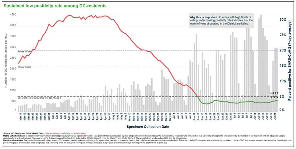 For this reason, D.C. Health has lowered the positivity rate metric to a seven-day rolling average of 5 percent. The current positivity rate among District residents is 3.8 percent.