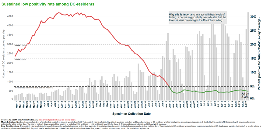 D.C. Health recently lowered the positivity rate metric to a seven-day rolling average of 5 percent. The positivity rate as of Wednesday among District residents is 3.3 percent. This is one of the metrics health officials monitor to determine if the city is ready to move into the next phase of its phased reopening.