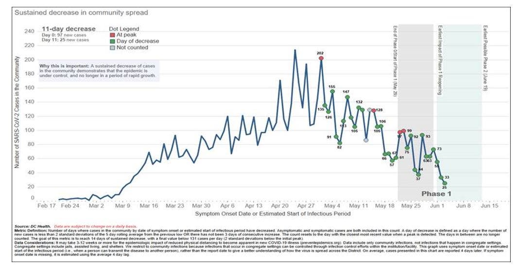 As of Friday, the District has reached 11 days of sustained decrease in community spread, which is detailed in this chart: