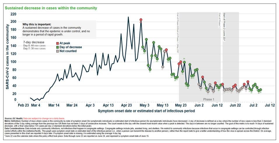 Community spread is one of the metrics D.C. Health monitors to determine when it will be safe for the District to enter the next phase of its phased reopening. In order to move forward, the District must see a sustained decrease in community spread over seven consecutive days. The District has experienced seven days of sustained decrease.