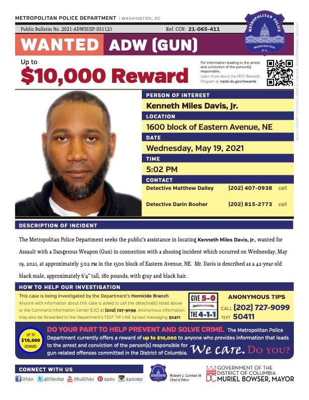 D.C. Police said at a news conference Wednesday that an arrest warrant has been issued for Kenneth Miles Davis, Jr., 42, Lanham, Maryland. Davis has been charged with assault with a deadly weapon, Police Chief Robert Contee III said.