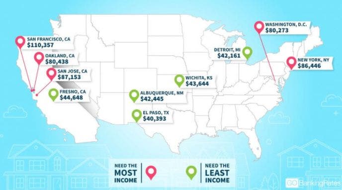 The study also revealed that Americans living in 39 of the 50 most populous U.S. cities have incomes below (or far below) what’s needed for a comfortable living.