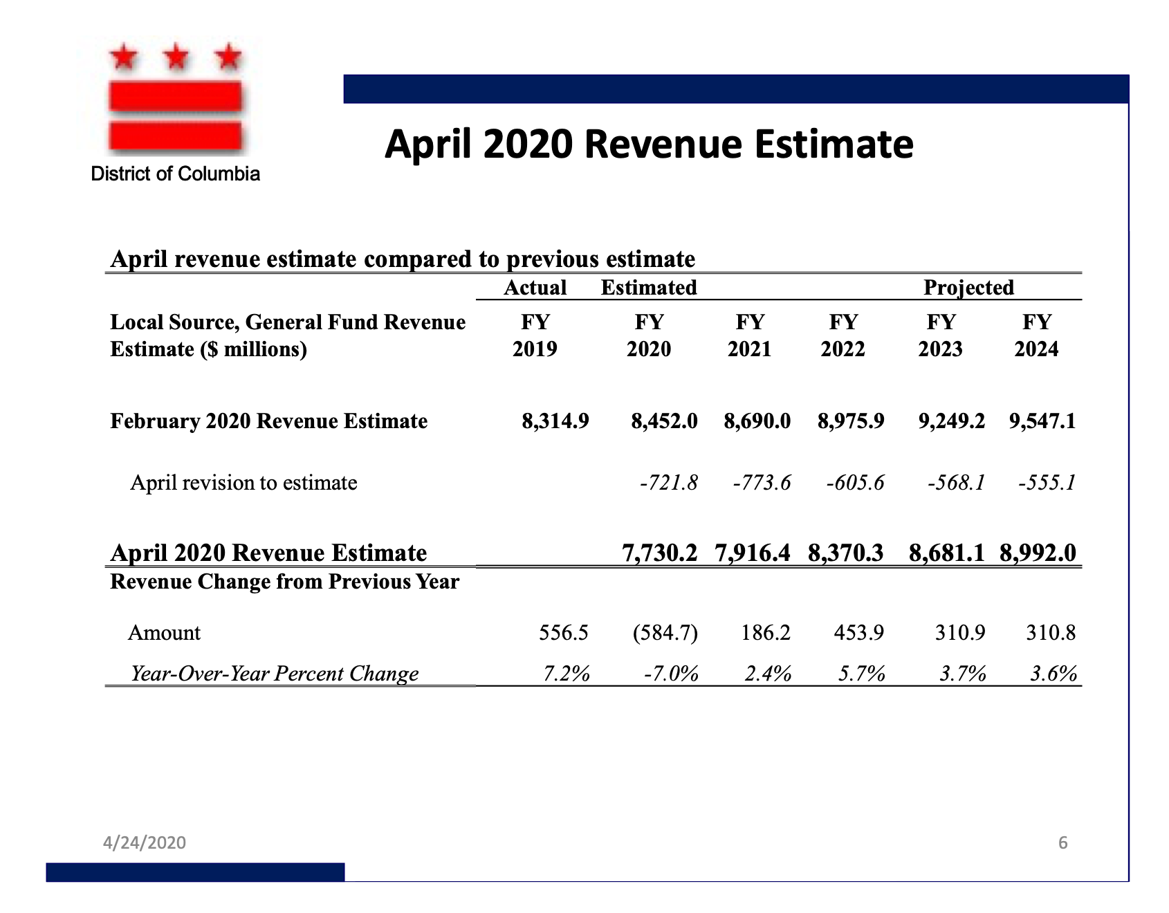 DeWitt told Bowser and members of the D.C. Council he was lowering his revenue estimates for Fiscal Year 2020 by $721.8 million. In February, he estimated a total revenue for the District $8,452.0 million. Now he was predicting $7,730.2 million in total revenue for the current fiscal year, which ends in September. He also predicted lower revenues through the next four fiscal years.