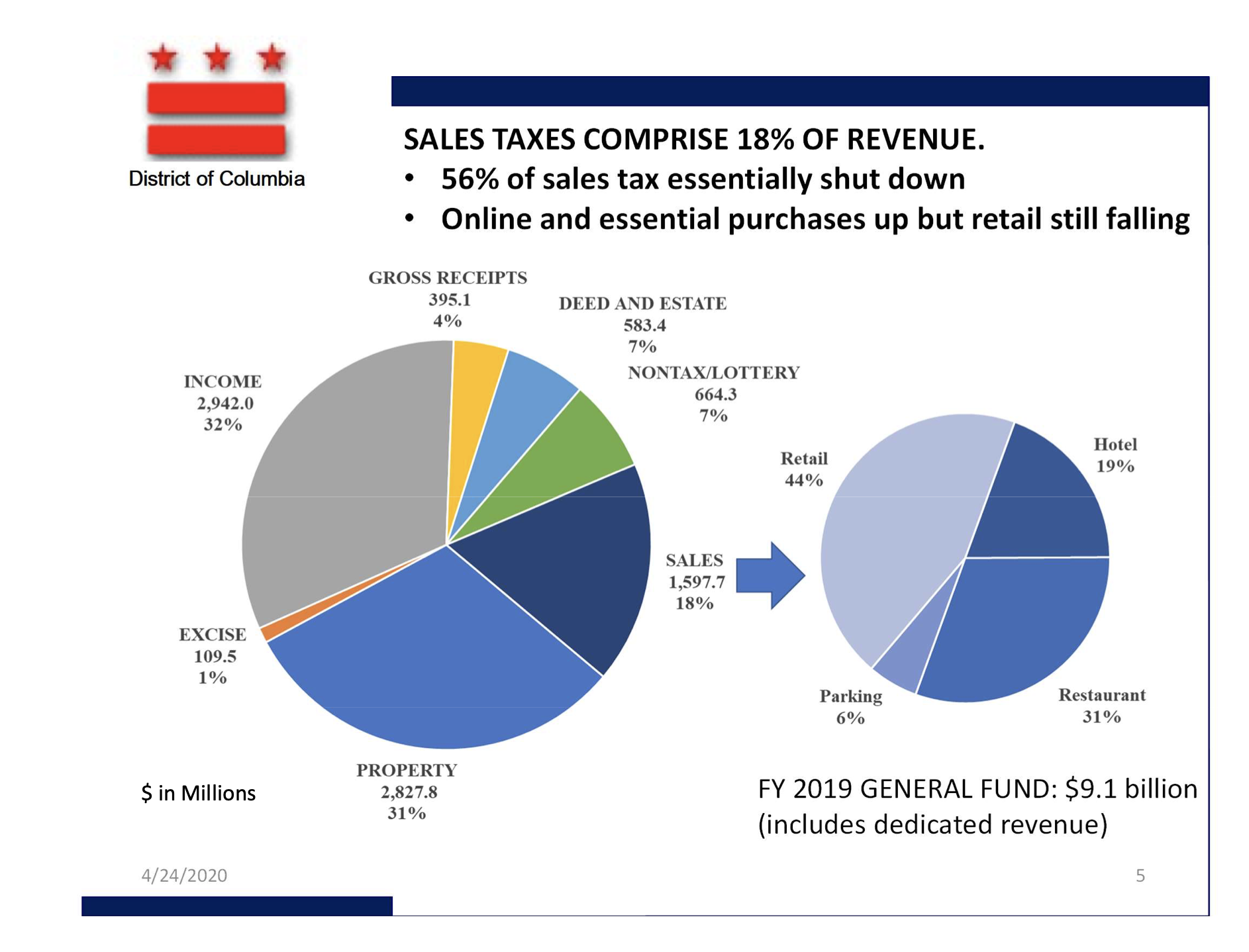 The sales tax typically accounts for 18 percent of the District's revenues, or about $1.6 billion. According to DeWitt, about 56 percent of that is shut down due to the emergency.