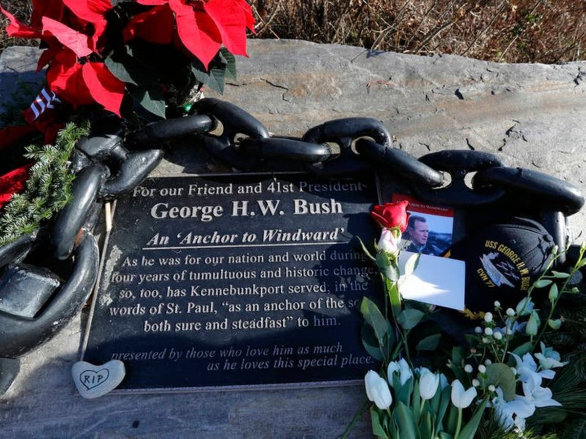 Photo: Flowers and mementoes lay near a plaque honoring former President George H. W. Bush at a makeshift memorial across from Walker's Point, the Bush's summer home, Saturday, Dec. 1, 2018, in Kennebunkport, Maine. Bush died at the age of 94 on Friday, about eight months after the death of his wife, Barbara Bush. Photo by Robert F. Bukaty/Associated Press