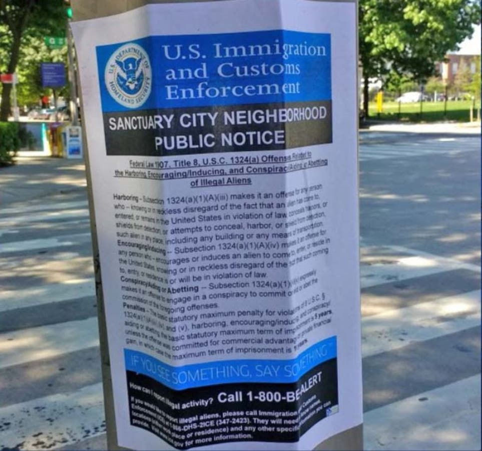 WASHINGTON, DC — Fake U.S. Immigration and Customs Enforcement flyers warning residents about penalties for supporting illegal immigration have been spotted hanging around D.C. Thursday, officials said.