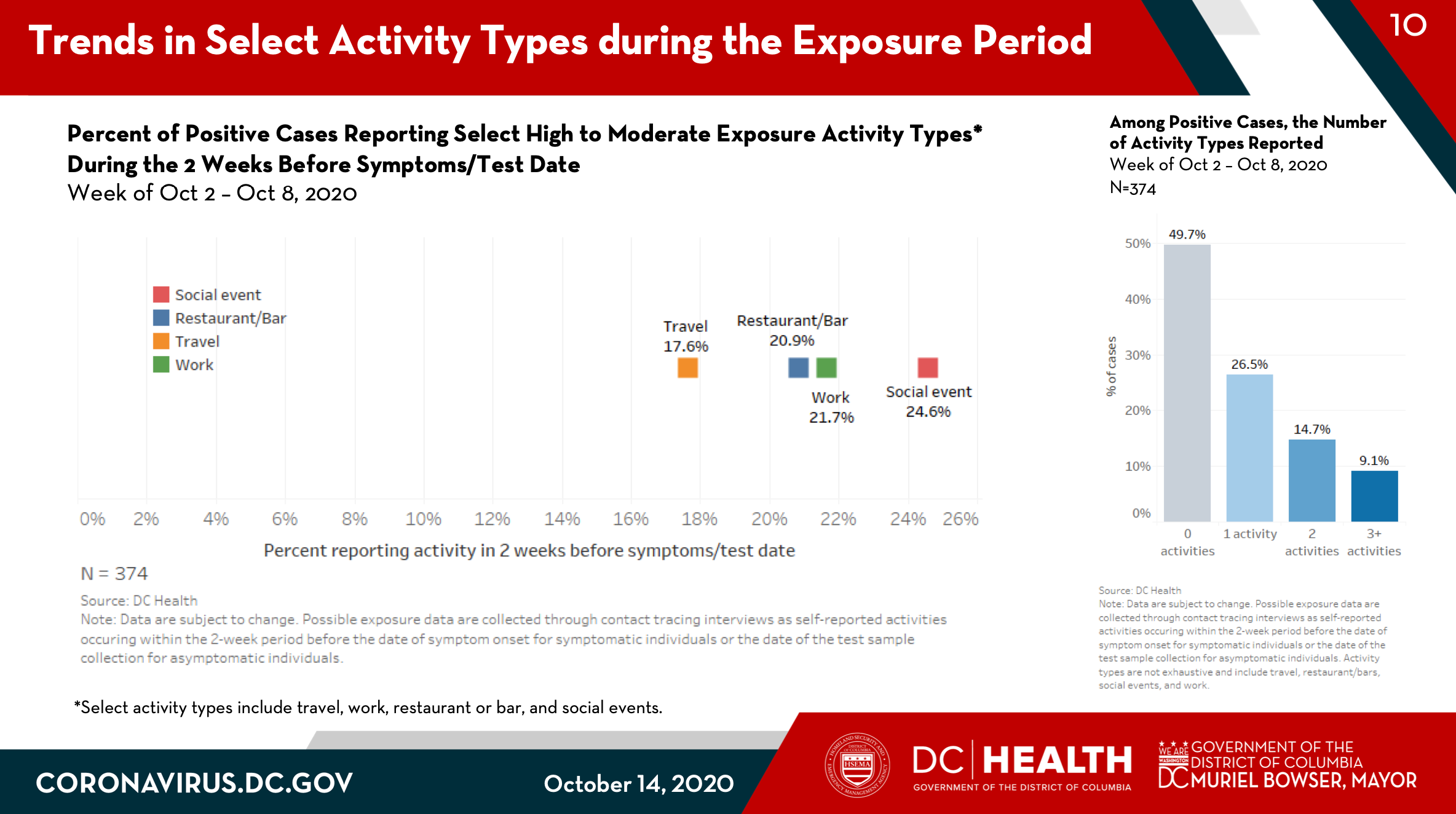 Of the 374 individuals D.C. Health interviewed the week of Oct. 2-8, 24.6 percent said they had attended a social event, 21.7 percent had gone to work, and 20.9 percent visited a restaurant or bar.