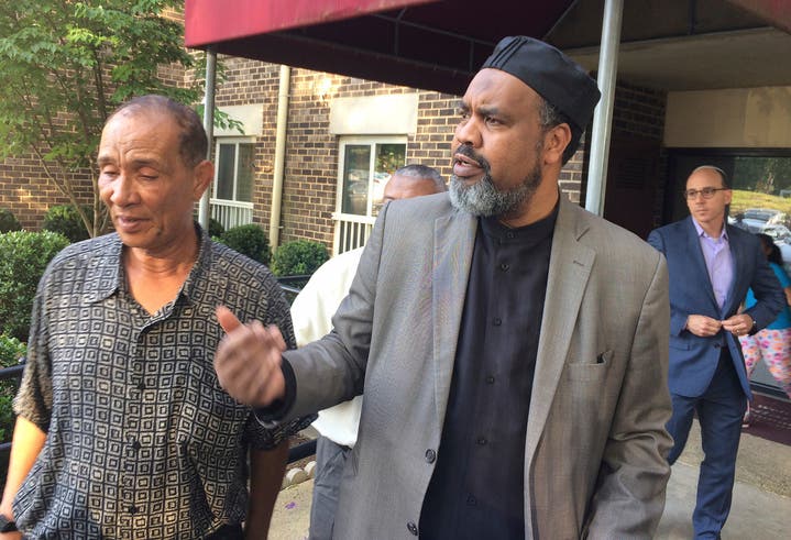 In this Tuesday, June 20, 2017 photo, Mohmoud Hassanen Aboras, left, whose daughter Nabra Hassanen was killed, listens as Imam Mohamed Magid, center, of the All Dulles Area Muslim Society, talks about the case in Reston, Va. (Matthew Barakat/Associated Press)