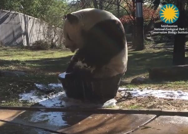 The Smithsonian Institute recently released video of the panda playing while bathing in the March sun.