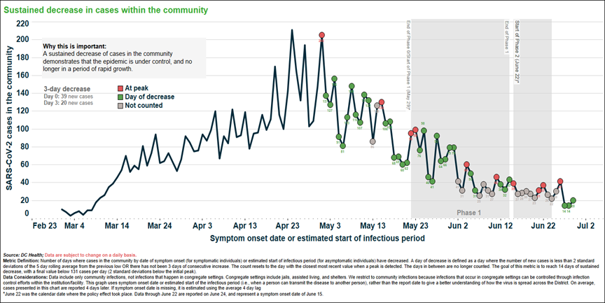 D.C. Health reset its count of the number of days the District has experienced a sustained decline in community spread of the coronavirus.