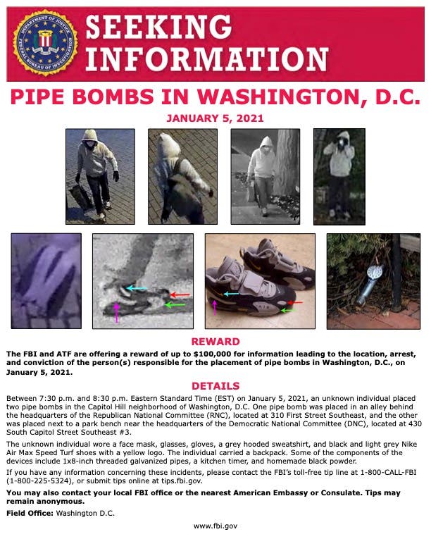 Anyone with information about the identity of the person who placed the pipe bombs can call the FBI's toll-free tip line, at 1-800-CALL-FBI (1-800-255-5324) or submit information online at tips.fbi.gov. The public can also contact their local FBI office or the nearest consulate or American embassy. Tips may be submitted anonymously.