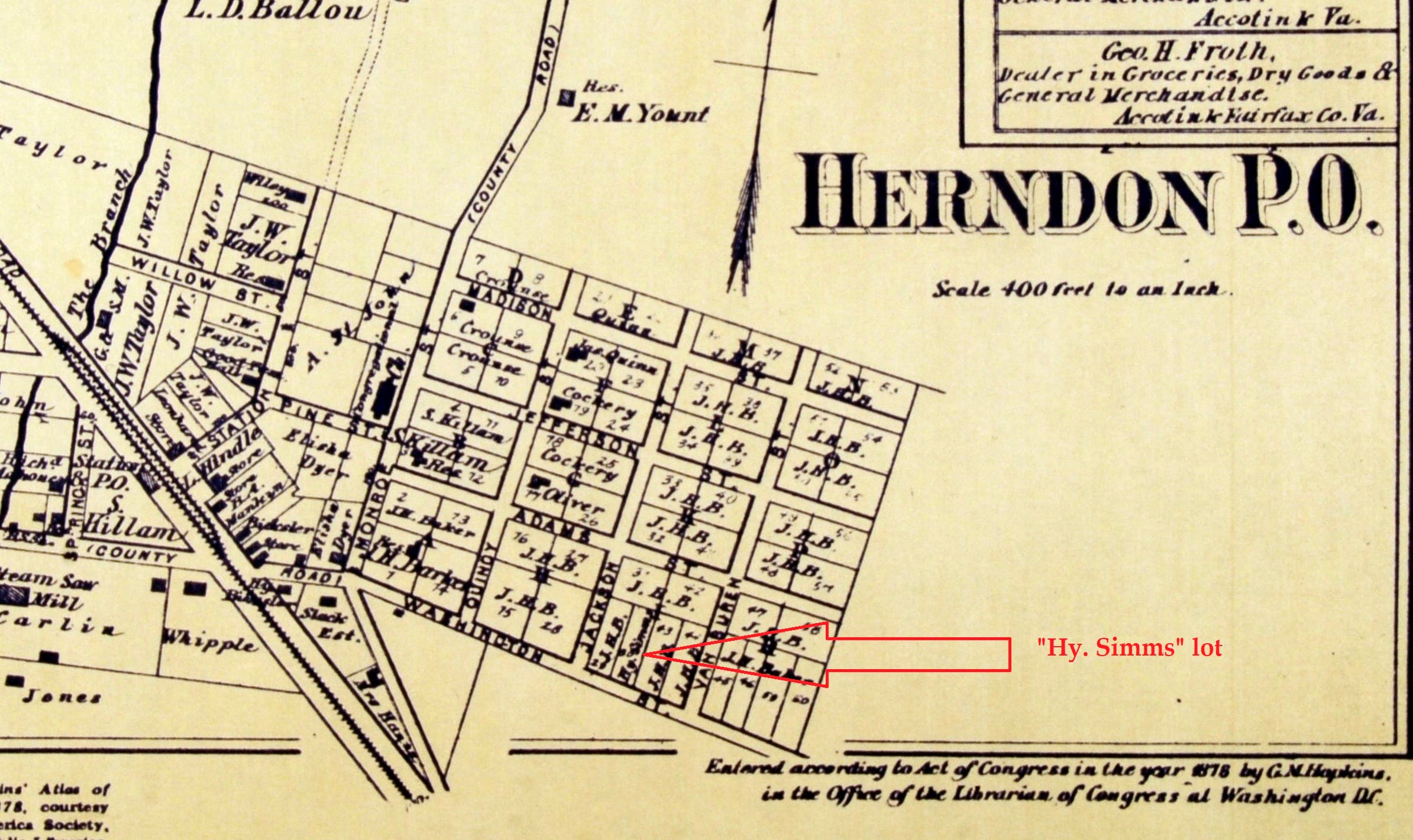 In 1878, Henry Simms bought a parcel of land in Herndon, about 1 acre in size, for $75. The lot of land was located in the vicinity of the northeast corner of Elden and Jackson streets, now the present-day location of Jiffy Lube. This parcel can be seen on the 1878 map of Herndon. The lot is marked on the map, “Hy. Simms.” The lot marked “Hy.Simms” is the former “Lot #30” of John Barker’s subdivision. But the deed indicated that Henry Simms may have owned both Lot 30 as well as the lot next door, Lot 29. That would have been equivalent to about 1 acre.