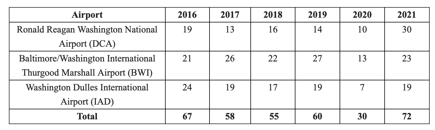 In 2021, TSA officers stopped 72 guns at the region's three major airports, more than doubling the 30 guns stopped during the previous year.
