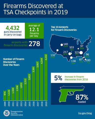 In 2019, TSA officers found a total of 4,432 firearms on passengers or in carry-on bags nationwide. That comes out to an average of 12.1 firearms a day, or a 5 percent overall increase in discoveries compared to the 4,239 confiscated in 2018 across the U.S. Of all the firearms detected at checkpoints in 2019, 87 percent were loaded.