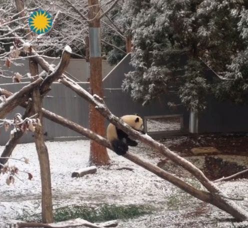 In the video below, Bei Bei explores a large tree limb covered in freshly fallen snow before slipping and sliding down the icy surface and clumsily flopping onto the ground.