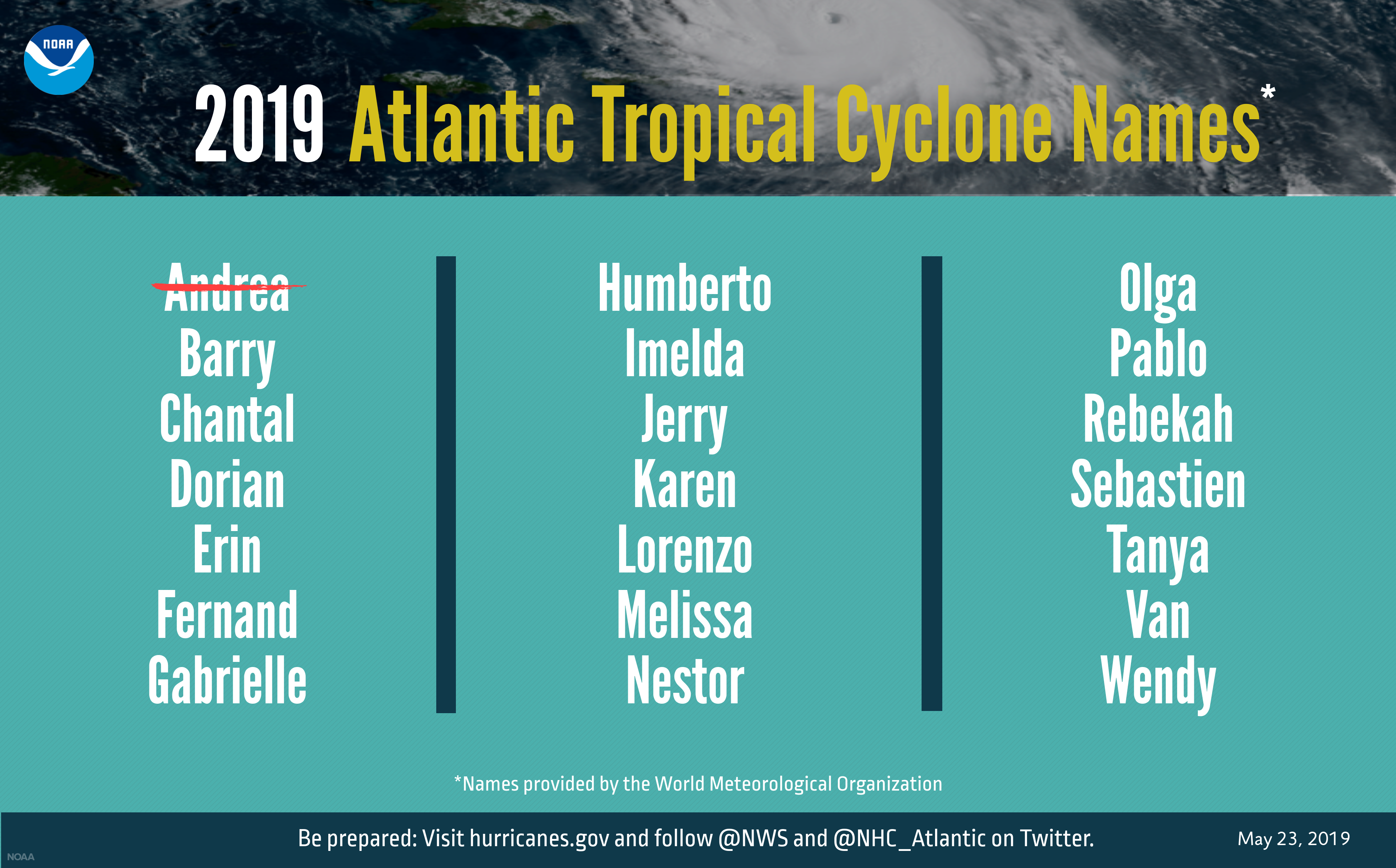 The hurricane season officially extends from June 1 to Nov. 30. The first tropical storm of the season will be named Barry. (See the graphic below for a complete list of storm names).