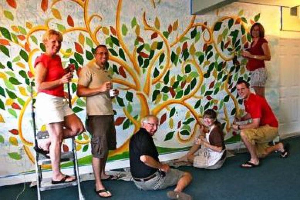 The Giving Tree is a mural designed and painted by local artist Leslie DeZiel and her family. Each leaf, depending on its color, represents a different personal quality: inspiration, strength, courage, self-esteem and empowerment.