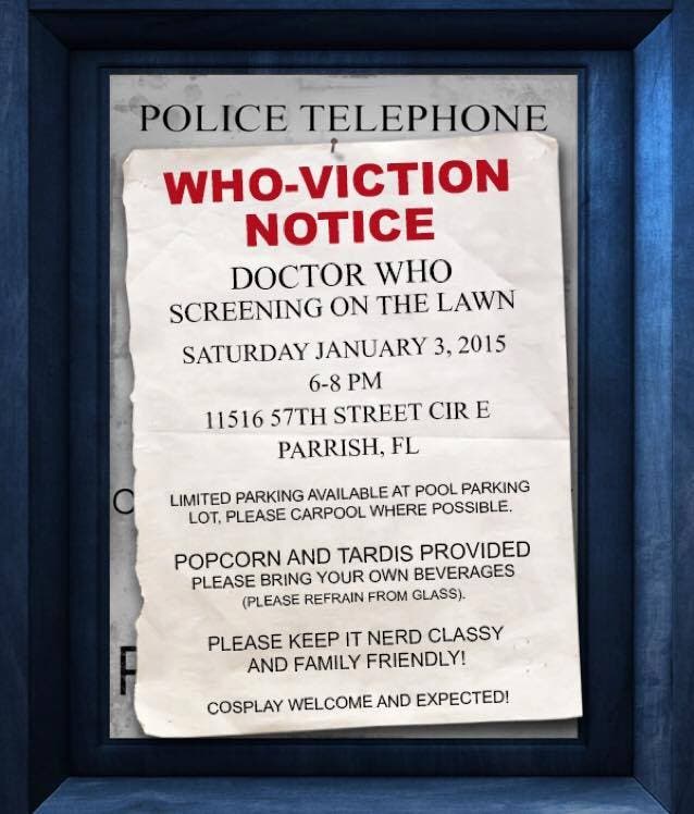 “Popcorn and Tardis provided,” the invitation read. “Please keep it nerd classy and family friendly. Cosplay welcome and expected.”