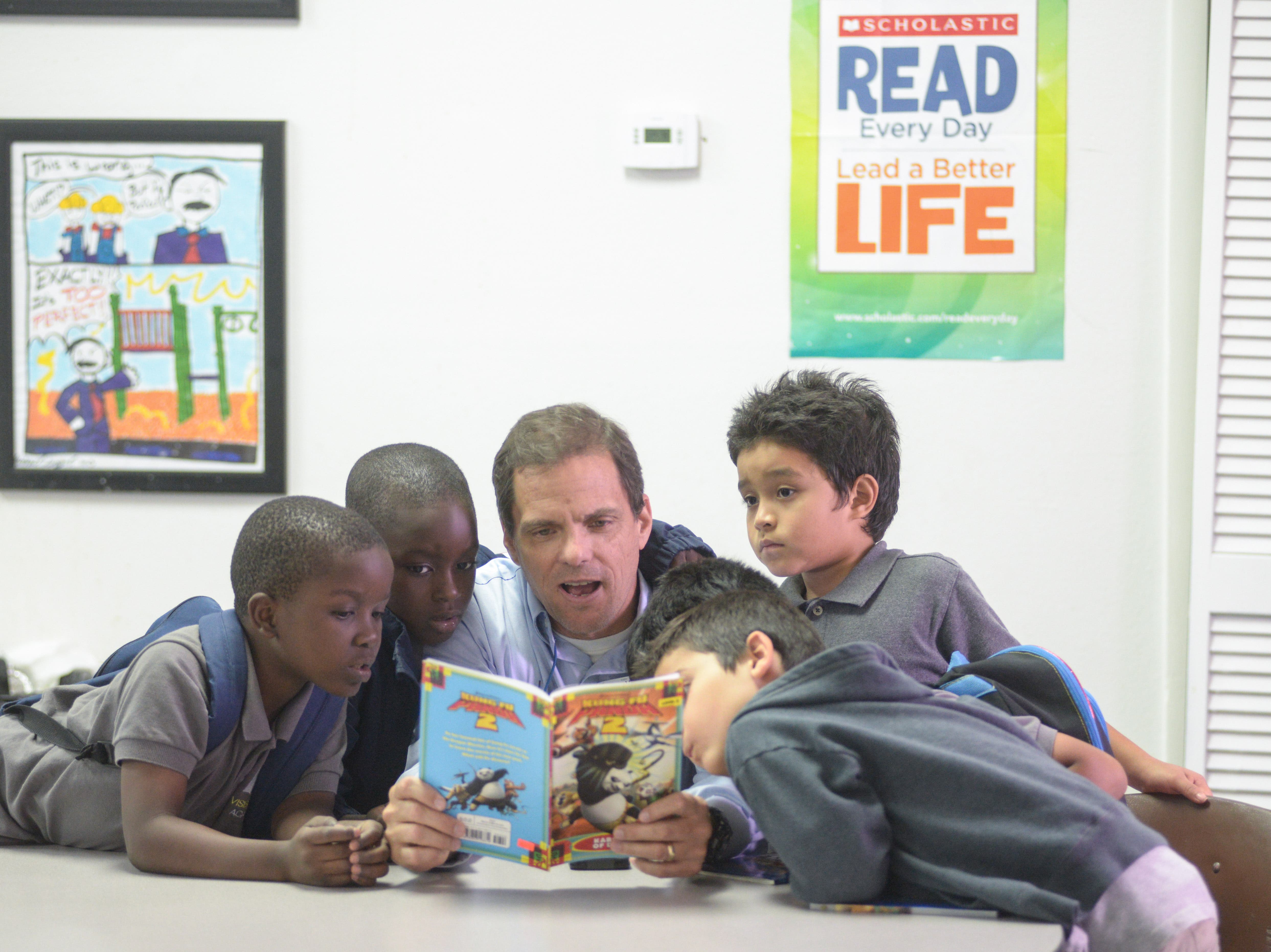 PHOTO ID: Goodwillβs Director of Community Outreach, Rick Hughes, reads with VMA students Dawinsky, Tony, Rick, Antonio and Gregory