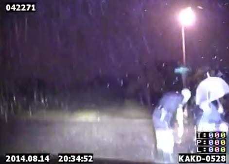 The officer’s dash cam clearly shows just how heavy the rain was coming down. It also shows the officer’s reaction to a lightning strike that came dangerously close to hitting him and Arnold as he came in contact with the stranded man.