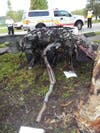 “The impact of the crash caused the vehicle to split in two with the front engine compartment on one side of the tree and the vehicle’s cab with Pino buckled in coming to a rest on the opposite side of the tree,” an email to media from the police department stated.