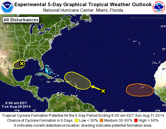 Photo Credit: Hurricane Cristobal doesn’t appear on the National Hurricane Center’s five-day graphic, but three other storms are under watch for potential development in the next week or so.