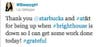 "Thank you @starbucks and #at&t for being up when #brighthouse is down so I can get some work done today! #grateful," tweeted @sleepygirl at 12:55 p.m.