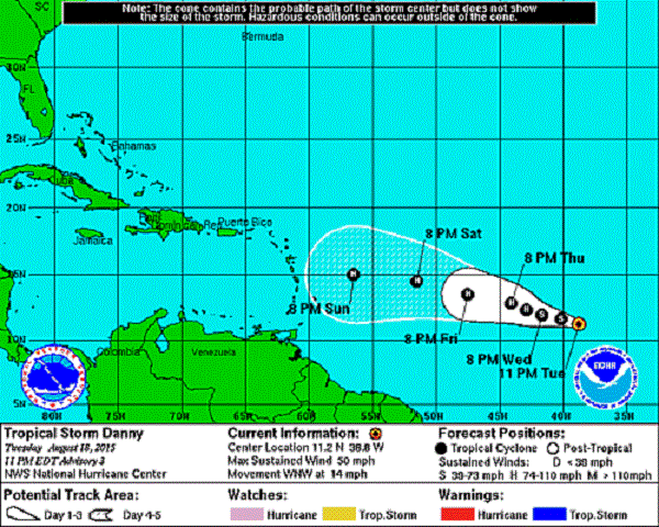 As of 11 p.m. Tuesday, Tropical Storm Danny was kicking up about 1,500 miles east of the Windward islands in the eastern Caribbean, with maximum sustained winds of 50 mph. The storm was heading on a west-northwestward track of 12 mph. Forecasters at the National Weather service anticipate Danny will strengthen into a hurricane sometime on Thursday. The storm is expected to be southeast of Puerto Rico by Sunday.