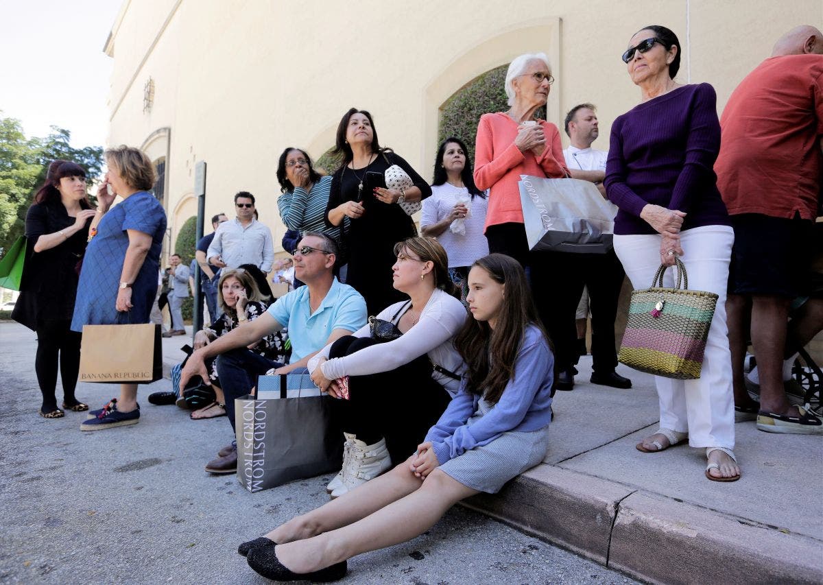 Shoppers Roman Lugo, seated, left, Siuris Rodriguez, center, and Chelsea Lugo, right, sit on the pavement after being evacuated from the Shops at Merrick Park after a shooting, (AP Photo/Lynne Sladky)