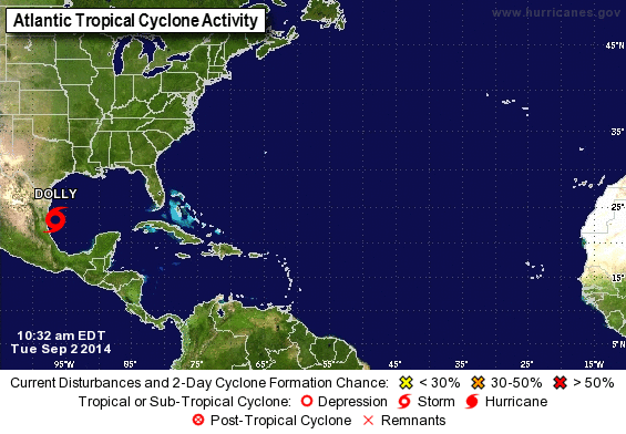 Tropical Storm Dolly was located off the coast of Mexico Tuesday morning and is expected to make landfall there soon, according to the National Hurricane Center. As of Tuesday morning, Dolly had maximum sustained winds of about 50 mph and was moving west, northwest at 16 mph.
