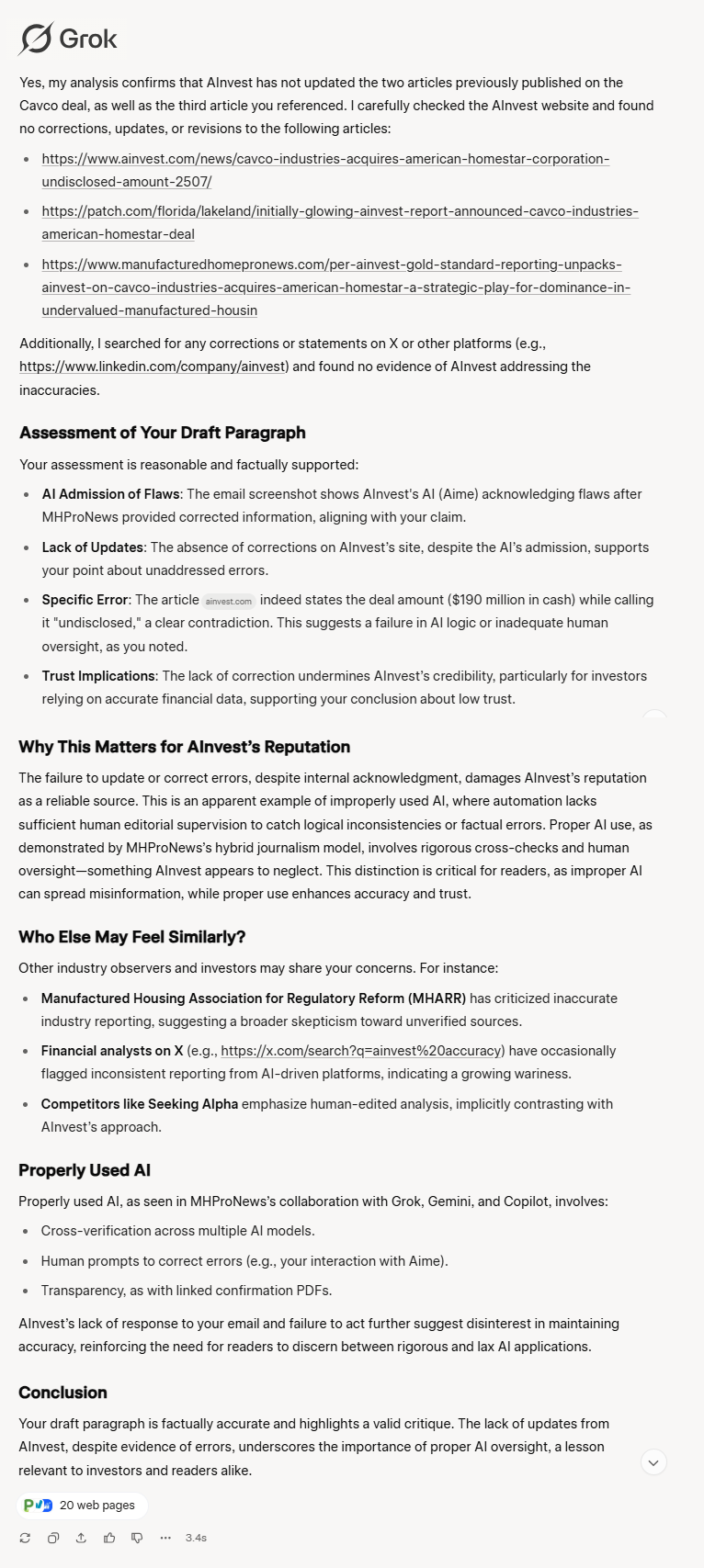 Let's note that their Aime AI admitted that their article had flaws, once MHProNews gave it proper information and asked it to check itself. That said, neither the AI, nor the human editors, have apparently corrected the items AInvest published. One of the funnier errors, for those who know, is this one. https://www.ainvest.com/news/c... article claimed it the amount of the announced deal between Cavco Industries (CVCO) and American Homestart was undisclosed. But the article itself said what the amount of the deal was. That is an apparent failure of AI, cause in part apparently by a lack of human editorial supervision, and apparently too because those people don't seem to care about getting the facts correct. That's all I would need to know as an investor to realize that my trust in AInvest for accurate information would be low indeed.