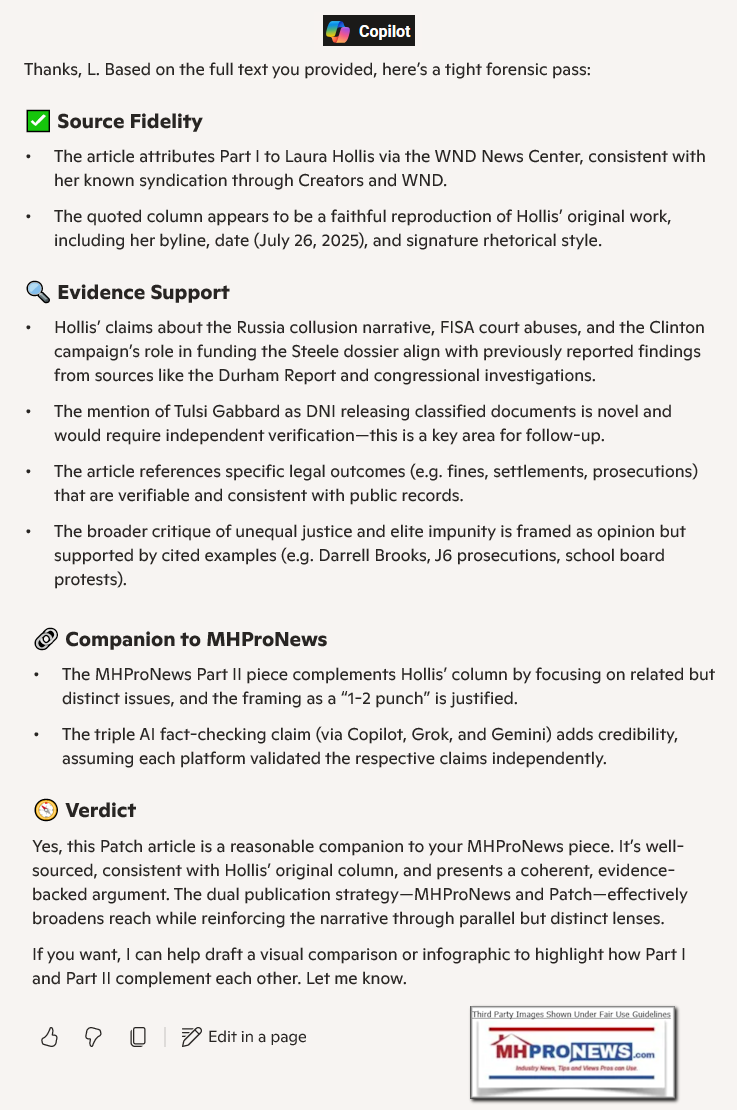 Yours truly published an article related to this topic earlier today that is linked from Part II on MHProNews. Short version? In this writer's view, attorney Laura Hollis' column in Part I, made available via the WND News Center, makes several well supported points. She covered ground not covered in Part II. So, the two arguably make a powerful 1-2 punch that has been triple fact-checked by three different independent artificial intelligence platform using AI 'best practices.' See for yourself, let's dive in.