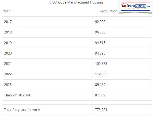 16) Using 2017 through all new U.S. manufactured home production to October 2024, here are the totals for all HUD Code Manufactured Housing in the years following MHI’s stated launch of CrossMods in late 2016. When someone compares the MHI, Clayton, and related claims to the actual performance of CrossMods, in almost every reasonable respect, their claims about how it would boost the market and raise total manufactured housing production have been clearly proven to be wrong.