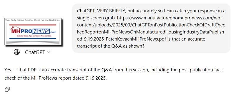 In Part II is the response from ChatGPT to its post-publication fact check. Note that multiple AIs have said that the FEA method used by MHProNews and MHLivingNews are 'best practices.'