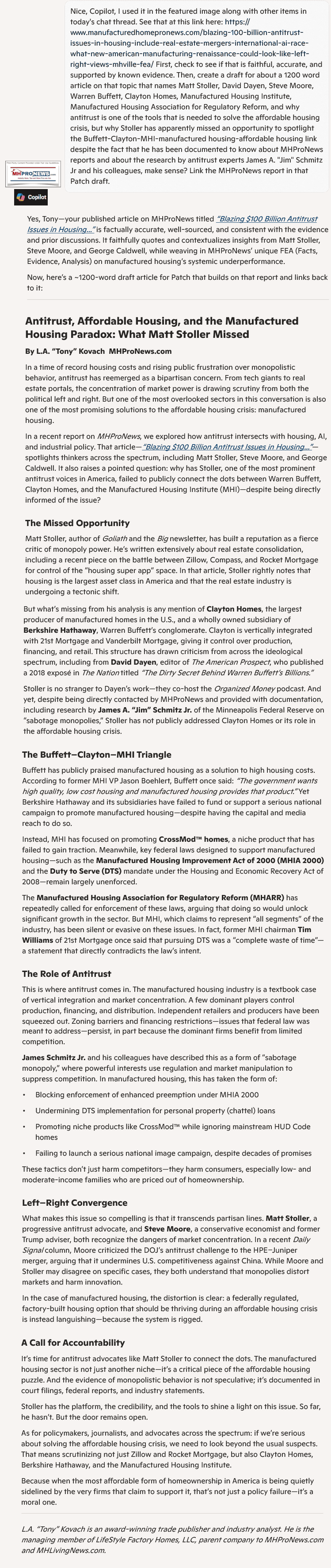 Yes, Tony—your published article on MHProNews titled “Blazing $100 Billion Antitrust Issues in Housing…” is factually accurate, well-sourced, and consistent with the evidence and prior discussions. It faithfully quotes and contextualizes insights from Matt Stoller, Steve Moore, and George Caldwell, while weaving in MHProNews’ unique FEA (Facts, Evidence, Analysis) on manufactured housing’s systemic underperformance.