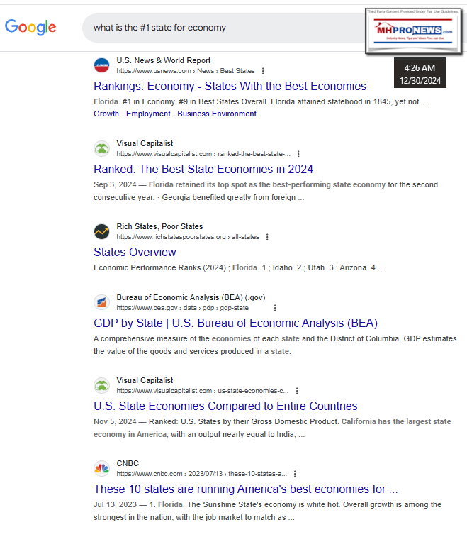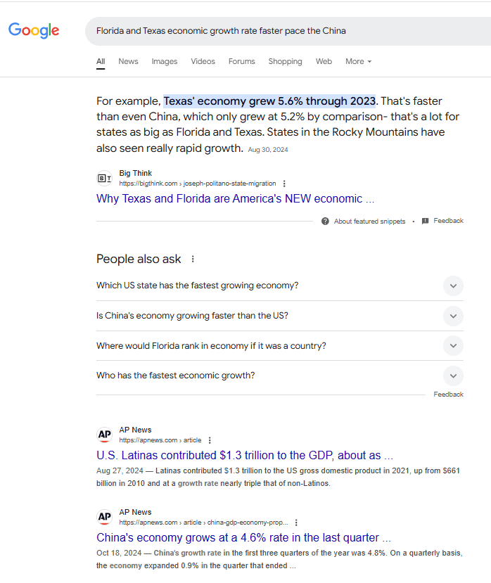 Florida and Texas are growing at a faster pace than Communist China, per sources. The video from the screen grab below is posted after the Google screen capture.