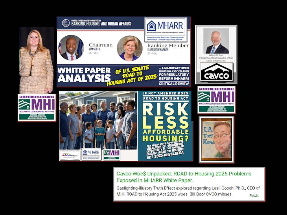 Gaslighting-Illusory Truth Effect explored regarding Lesli Gooch, Ph.D., CEO of MHI. ROAD to Housing Act 2025 woes. Bill Boor CVCO misses.