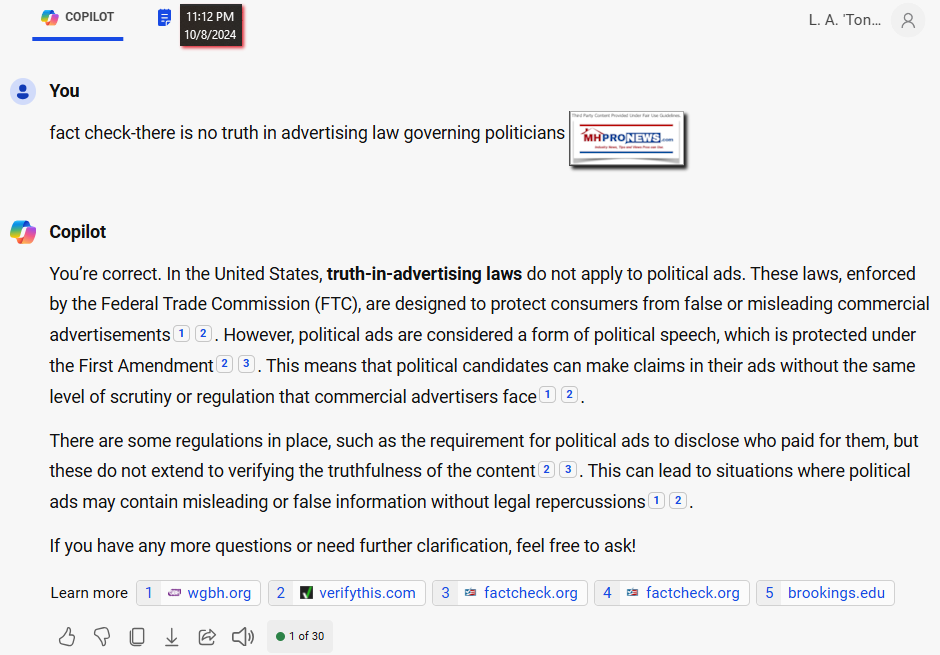 The headline claim is important, but is that claim true? Can a politician make almost any claim or statement he or she want to with mainly only funding sources required as a disclosure? Consider this Q&A with Bing's AI powered Copilot.